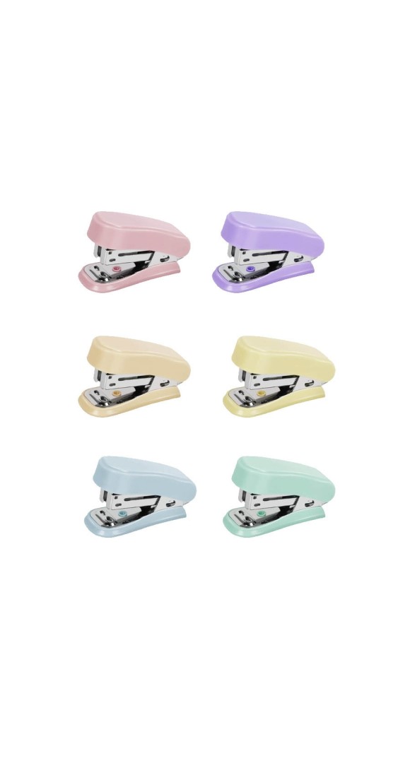 Grampeia até 12 folhas, usado o grampo 26/6. Estrutura em metal com corpo plástico em tons pastel.
